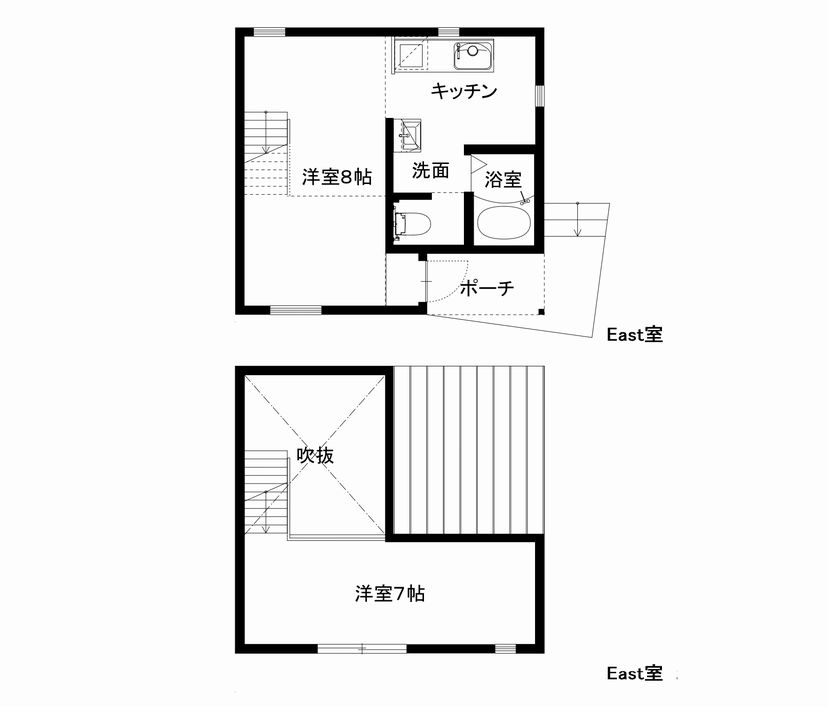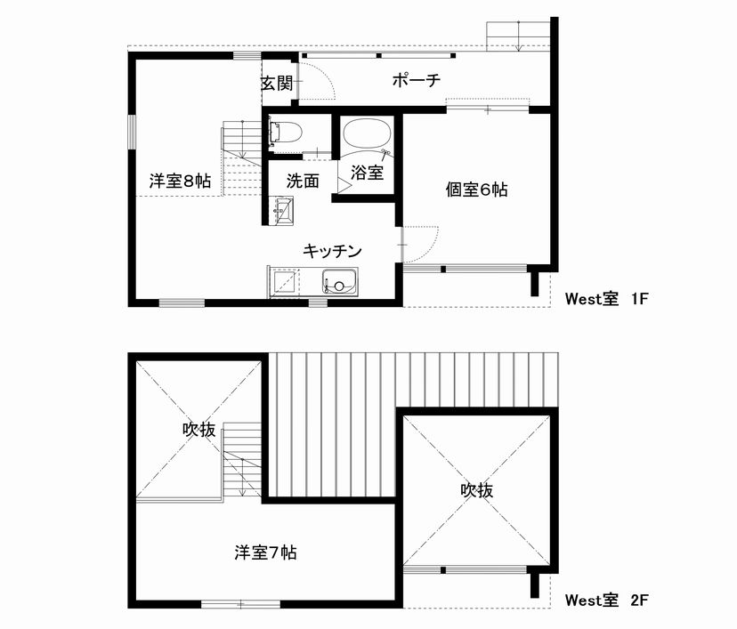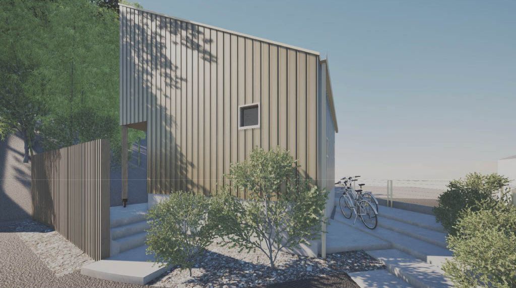 静かな住宅街に建つ、2棟だけの賃貸住宅。手前がEast室、奥がアトリエ付きのWest室です。